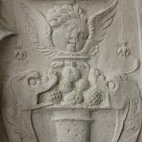 Putto ailé armé d'un arc sur un boulet encadré par deux dauphins |