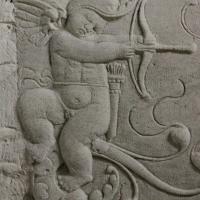 Putto ailé armé d'un arc combattant un dauphin |