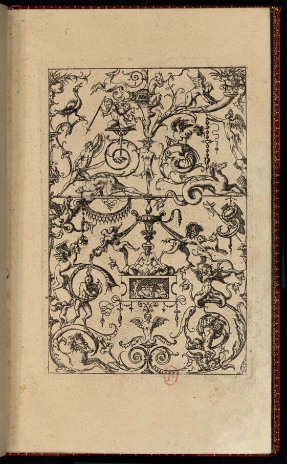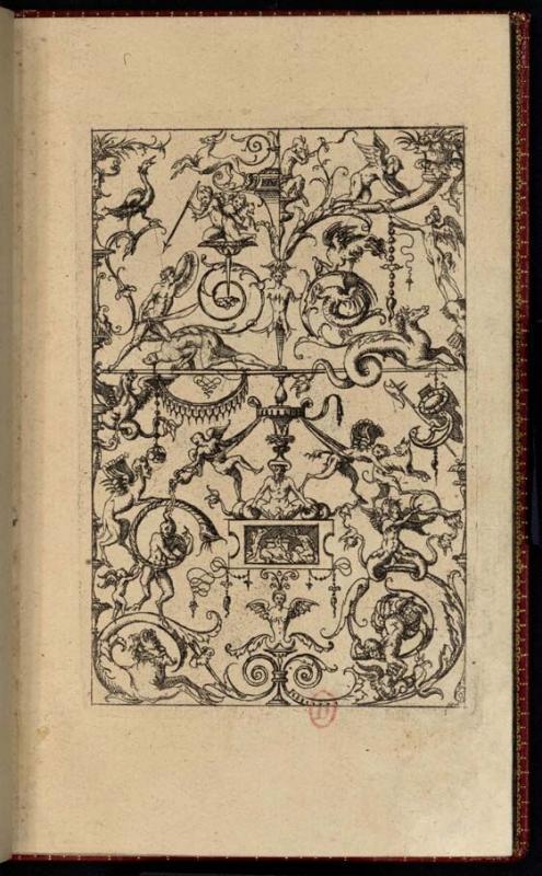 Jacques Androuet du Cerceau, Petites grottesques, 1562 (2nde éd.), p. 9 (Paris, INHA, NUM 12 RES 23) - scénette putti 2.jpg